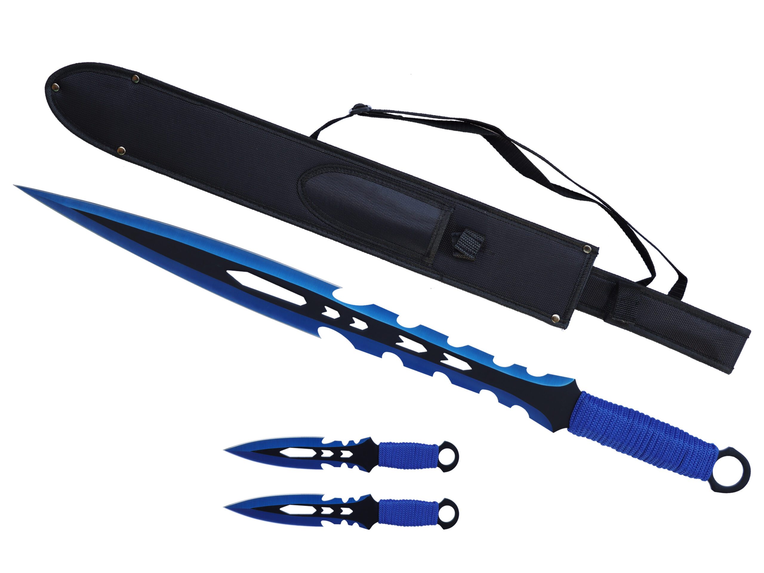 27″ Tactical Machete Sword w/ Two 8″ Throwing Knives (Blue)