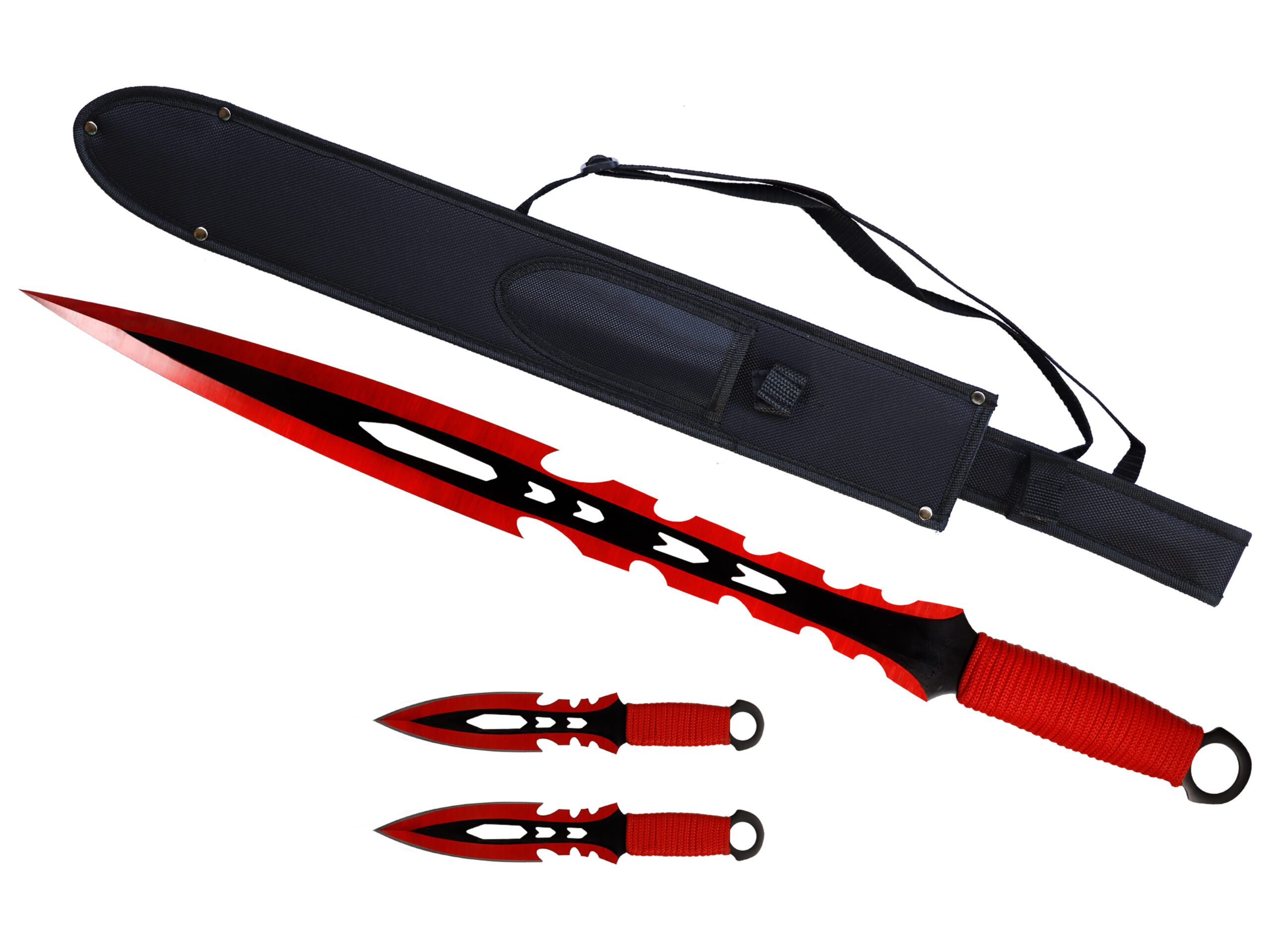 27″ Tactical Machete Sword w/ Two 8″ Throwing Knives (Red)