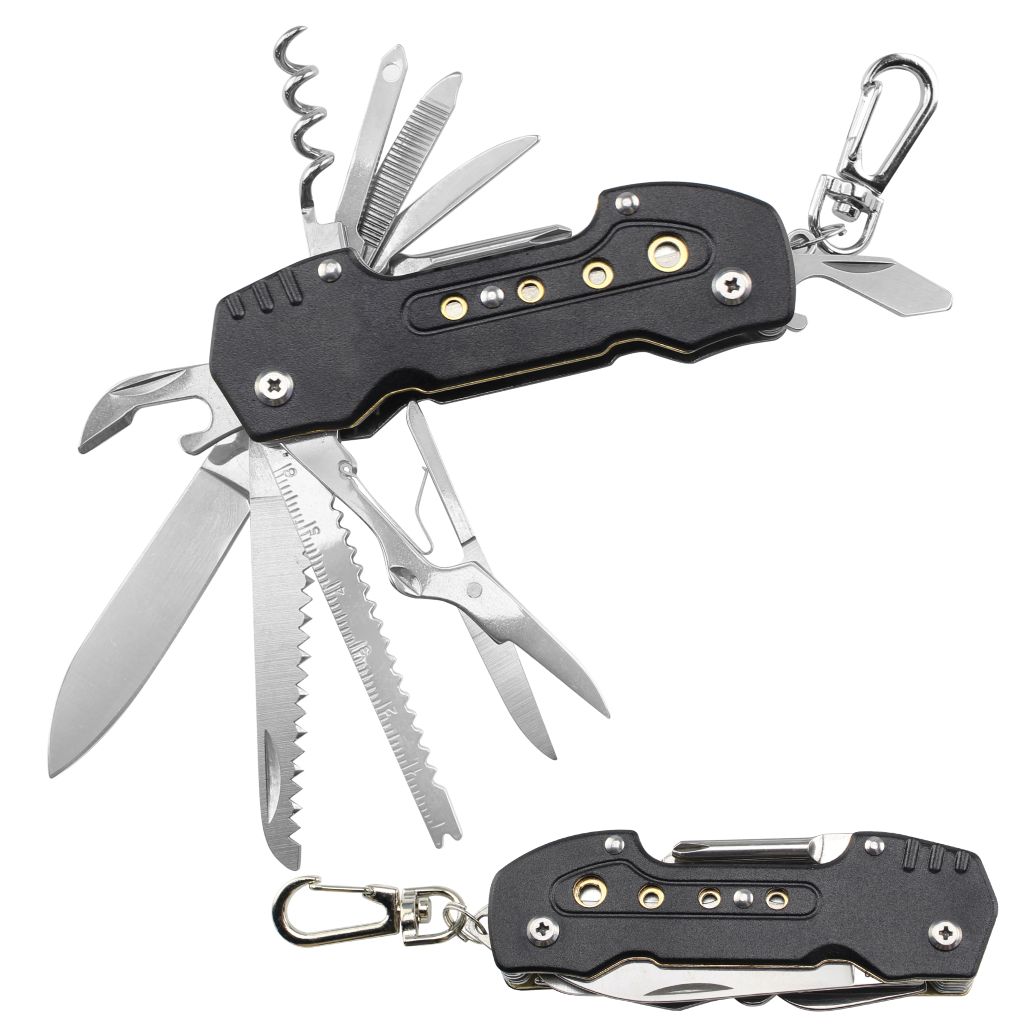 - includes: knife, scissor, saw, bottle opener, screwdriver, compass, and more.