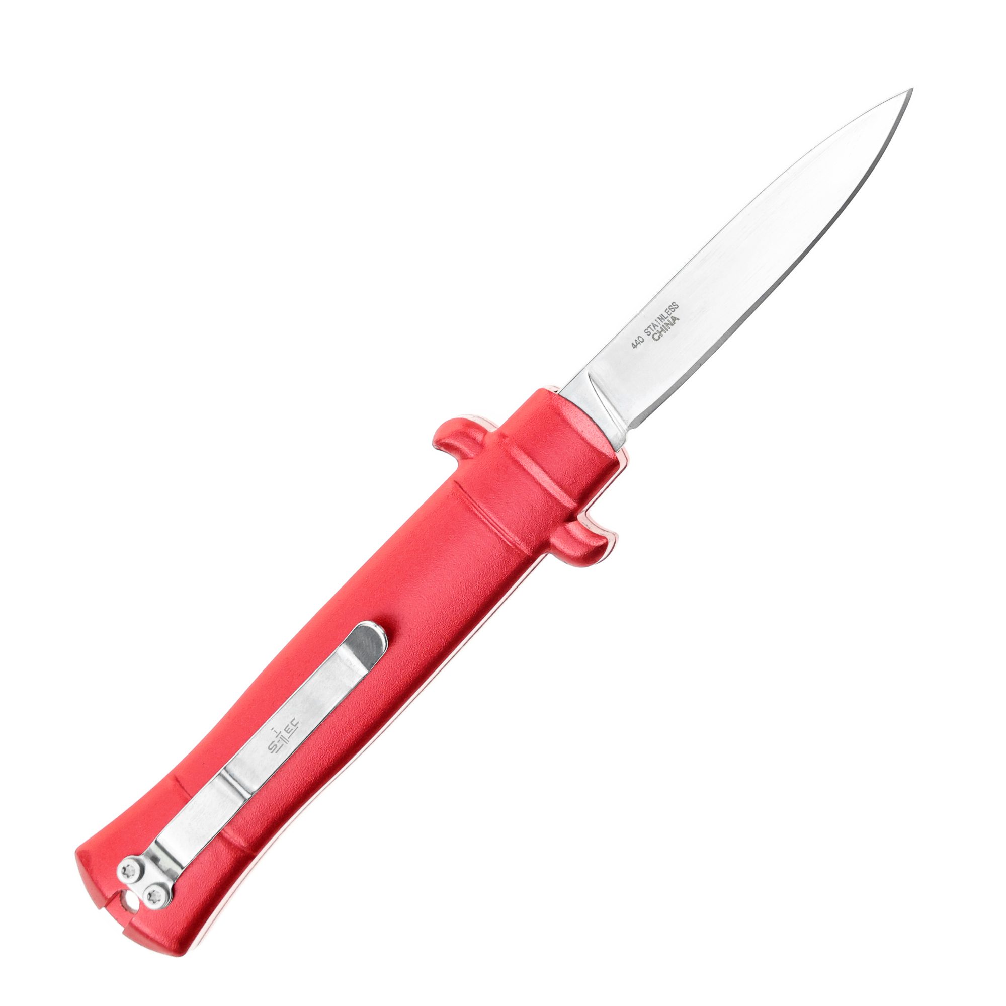 - 5.25″ Anodized Aluminum Handle Mini OTF w/ Pocket Clip- Red