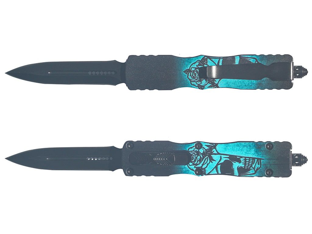 8.5″ Zinc Handle OTF – Black Handle w/ Skull and Rose
