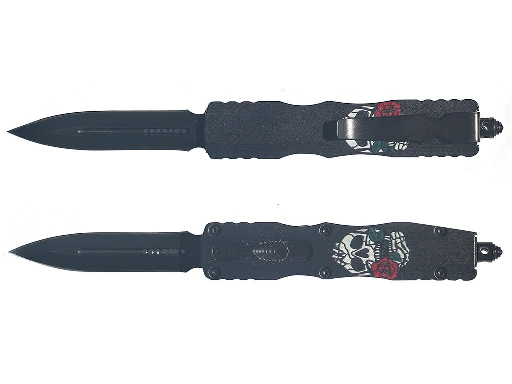 8.5″ Zinc Handle OTF – Black Handle w/ Skull and Rose3